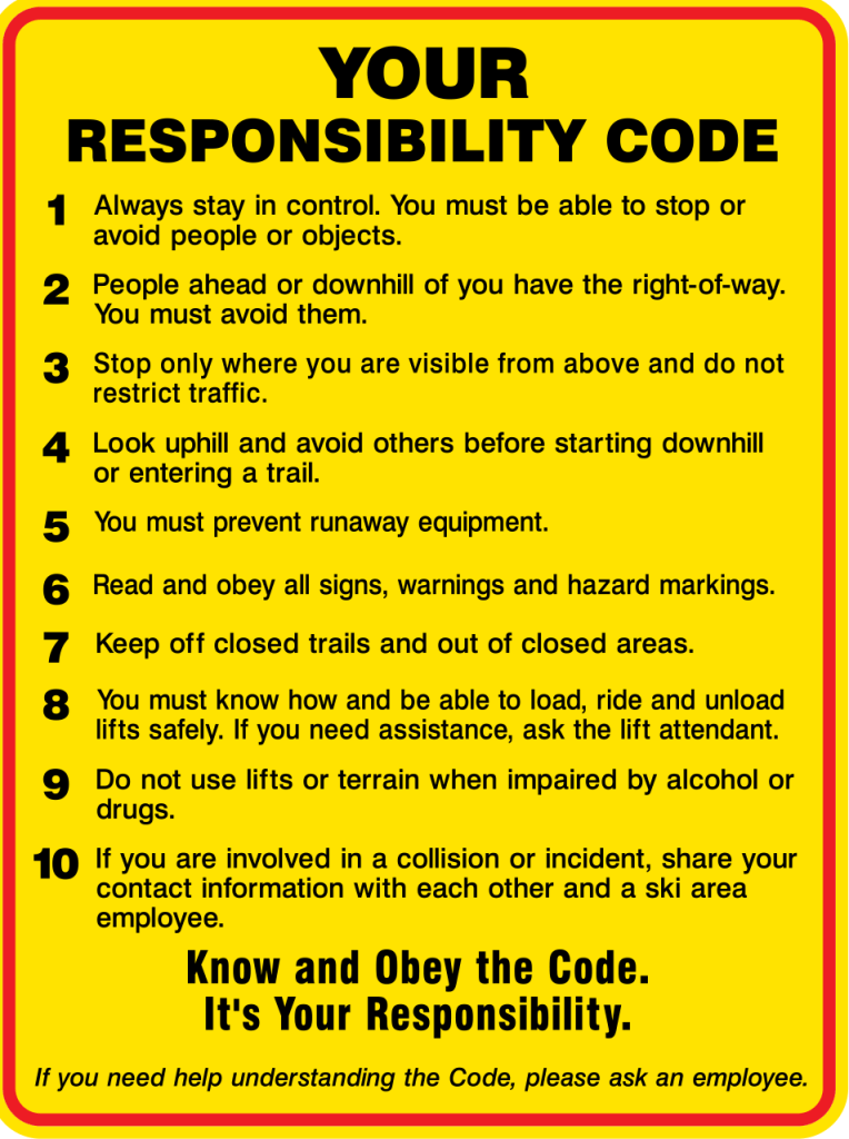 Take a look at the responsibility code below, familiarise yourself and others, and this way, you will hopefully have a safer time on the hill skiing/snowboarding